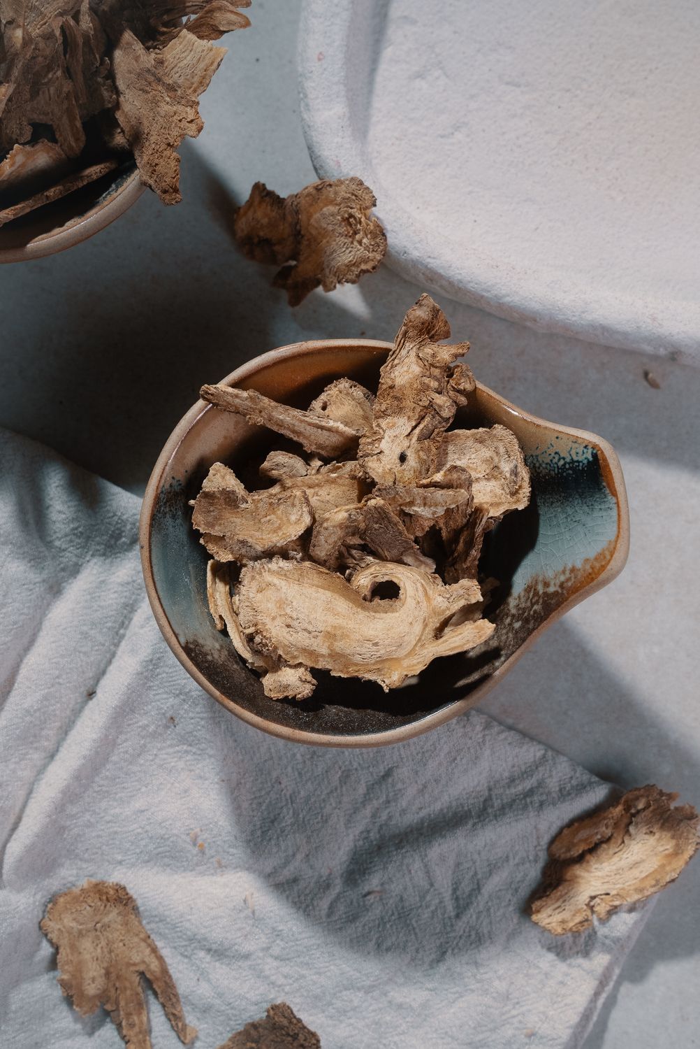 Dangshen, Baizhu, Danggui und Shoudi von Asche befreien, trocknen und zu Pulver verarbeiten.